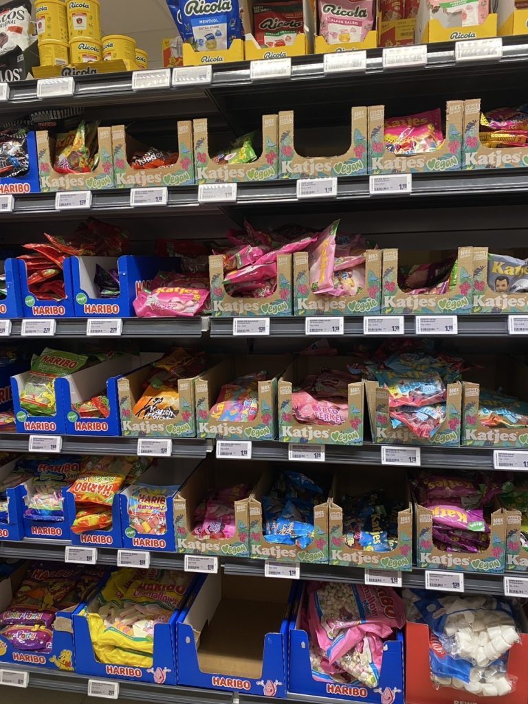あることを願って行ってみました。さすがはHARIBO発祥の地ドイツ、棚には多くHARIBOが並んでいましたが、、、目当てのチョコマシュマロだけ品切れとなっていました。(写真の一番下)